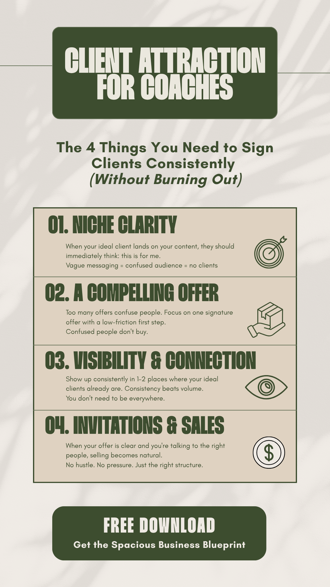 Attracting coaching clients consistently doesn't require you to hustle harder or be everywhere. It requires clarity, simplicity, and a strategy that's designed around your life, not in spite of it.